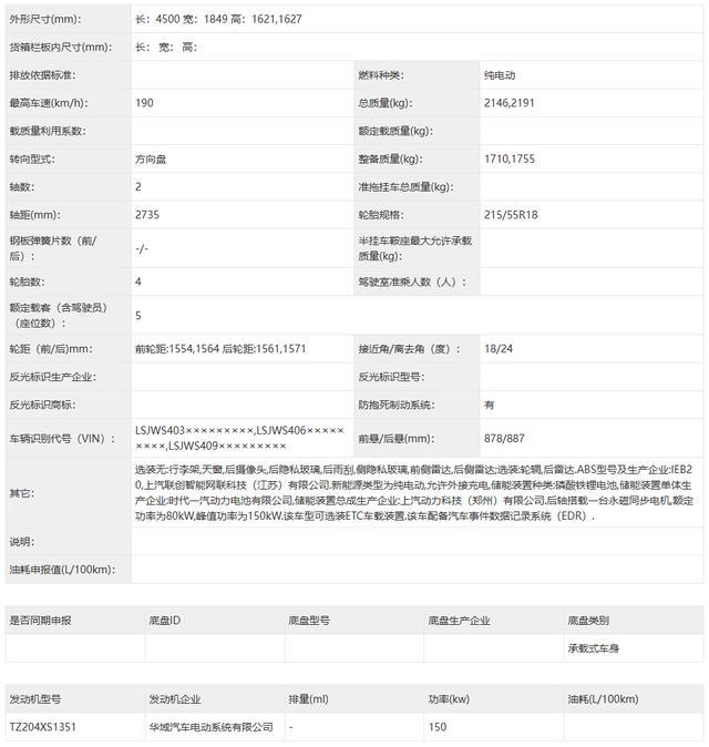 申报信息显示,这款新车长宽高为 4500mm*1849mm*1621(1627)mm,轴距为 2735mm。后轴搭载一台永磁同步电机,额定功率为 80kW,峰值功率为 150kW。