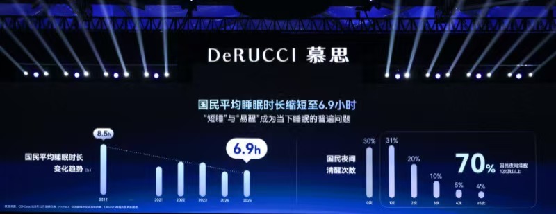 经过企业20多年的发展,对于床垫产品的需求,已经完成了从“功能消费”到“价值消费”的跃迁。国民平均睡眠时长缩短至6.9小时,七成人群夜间至少清醒1次。“短睡”与“易醒”成为核心困境,而七成的受访者却表示“越睡越累”。
